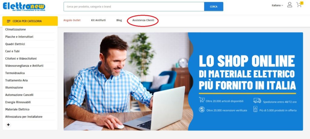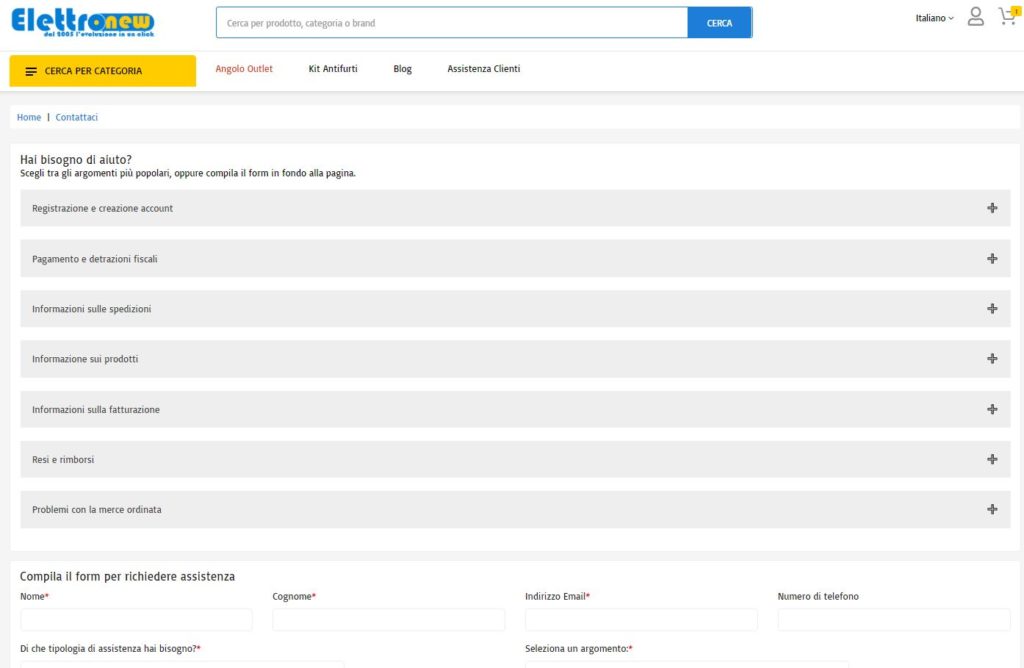 Come è cambiato Elettronew, dunque? L’Home page è strutturata in modo semplice ed intuitivo. In alto c’è la classica barra di ricerca, dove poter inserire il nome o il codice del prodotto cercato. Sotto di essa troverete il link “Assistenza clienti”. Cliccandoci su, sarete reindirizzati ad una pagina dove sono presenti tutte le informazioni necessarie: