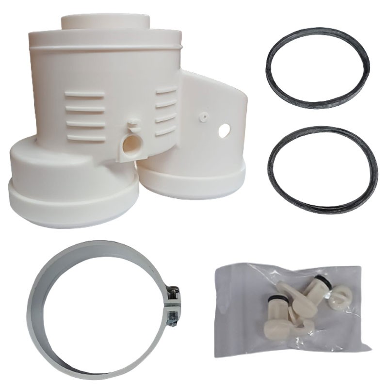 Er dient zum Anschluss des Heizkessels an die beiden Rohre, das Abgas- und das Luftansaugrohr. Er ist für den ordnungsgemäßen Betrieb unerlässlich, insbesondere wenn der Kessel im Haus installiert ist. Er ermöglicht es, dass die Ansaugleitung nach außen führt, und die Abgasleitung wird an den Schornstein angeschlossen.