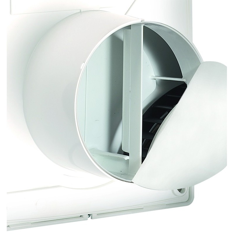 - Die Rückluftsperrklappe am Anschlussstutzen verhindert den Kaltlufteinfall bei ausgeschaltetem Ventilator