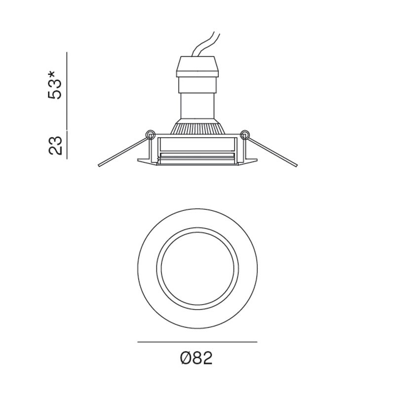 Der Strahler ist für den Einbau mit einem Rahmen konzipiert und hat einen Durchmesser von 82 mm und eine Höhe von 25 mm, kompakte Abmessungen, die den Einbau in kleinen Räumen erleichtern. Dank der Schutzart IP20 ist er nur für trockene Innenräume geeignet.