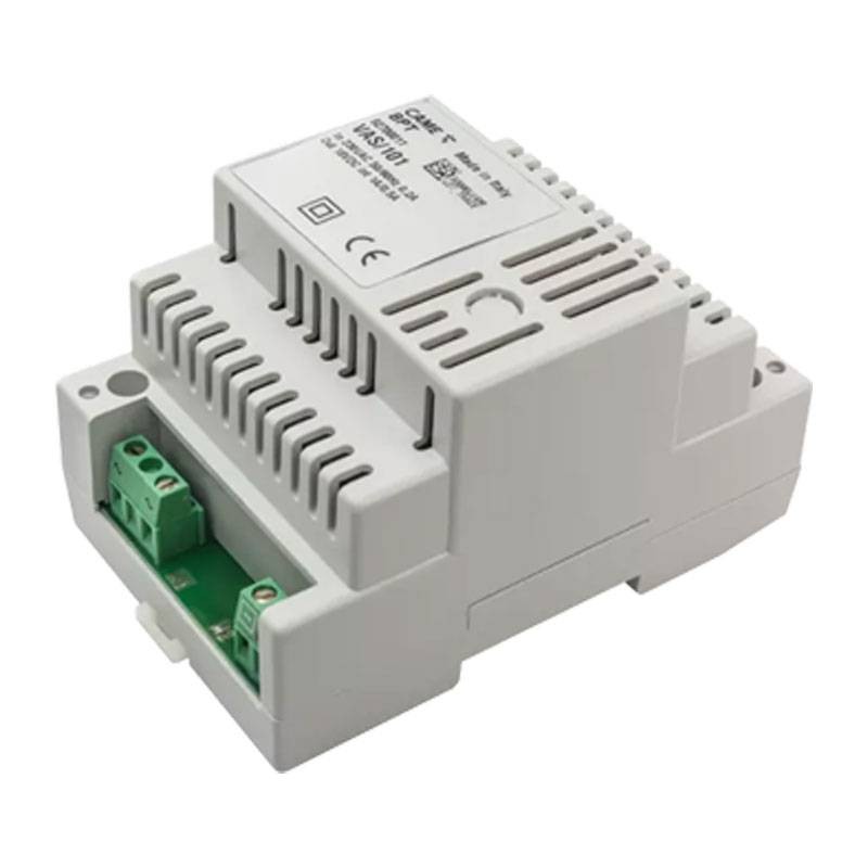 Das Kit enthält das Netzteil 62700011, in einem Kunststoffgehäuse für die Installation auf EN50022-Schiene, 4 Module DIN niedriges Format, ideal für Schaltschrank. Es versorgt die Außenstation und interne Ableitungen mit 18 V DC 1000 mA max und integriert einen elektronischen Schutz gegen Überlastungen und Kurzschlüsse. Der Eingang erfolgt über das Netz 230 V AC 50/60 Hz, mit Schutzart IP30 für Installationen in geschützter Umgebung.