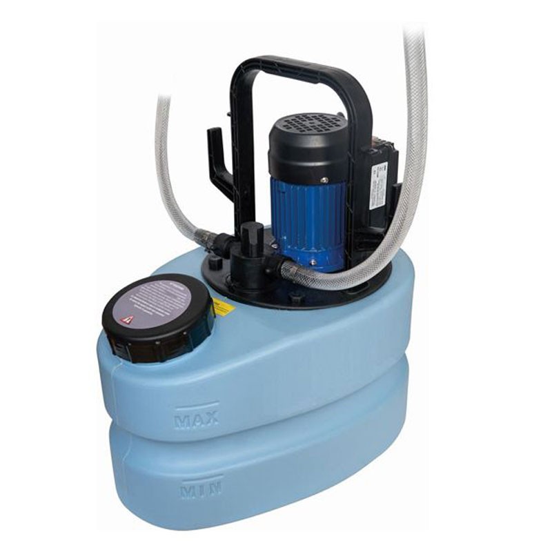 Pumpe mit vertikaler Achse, Tank und Absperrventilen für die Spülung von kleinen Anlagen (oder Teilen von großen Anlagen) mit speziellen Chemikalien.