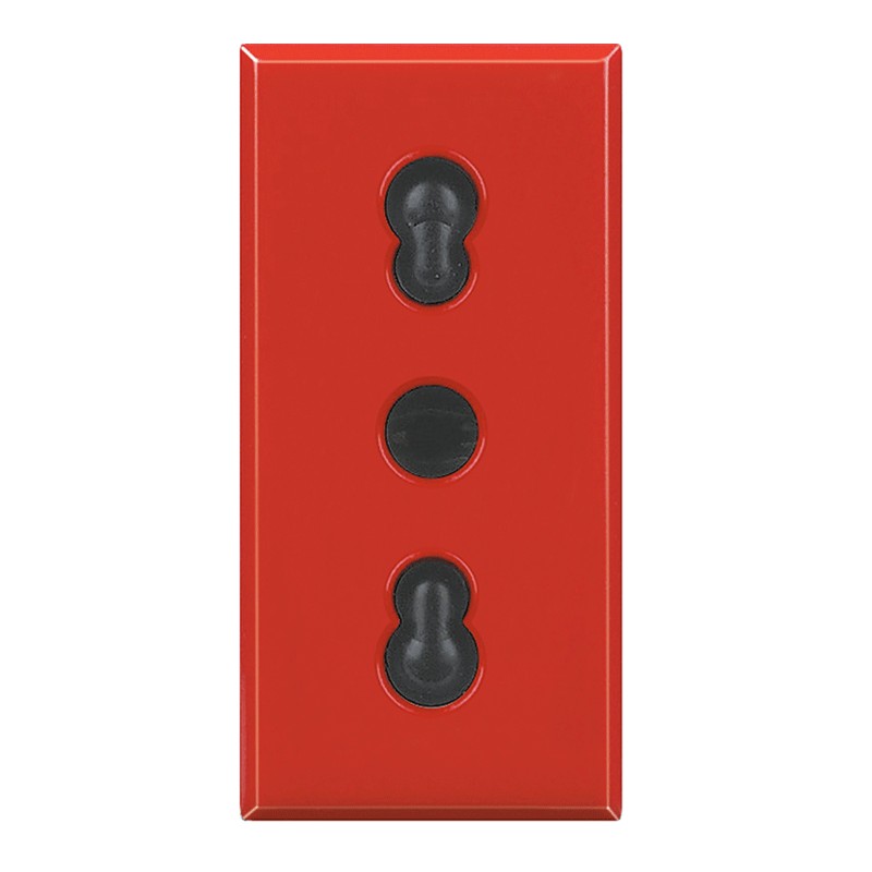 Bticino Axolute rote Zwei-Wege-Steckdose. In die zweipolige Steckdose können Sie sowohl 10A-Stecker (kleine Stecker) als auch 16A-Stecker (große Stecker) einstecken.