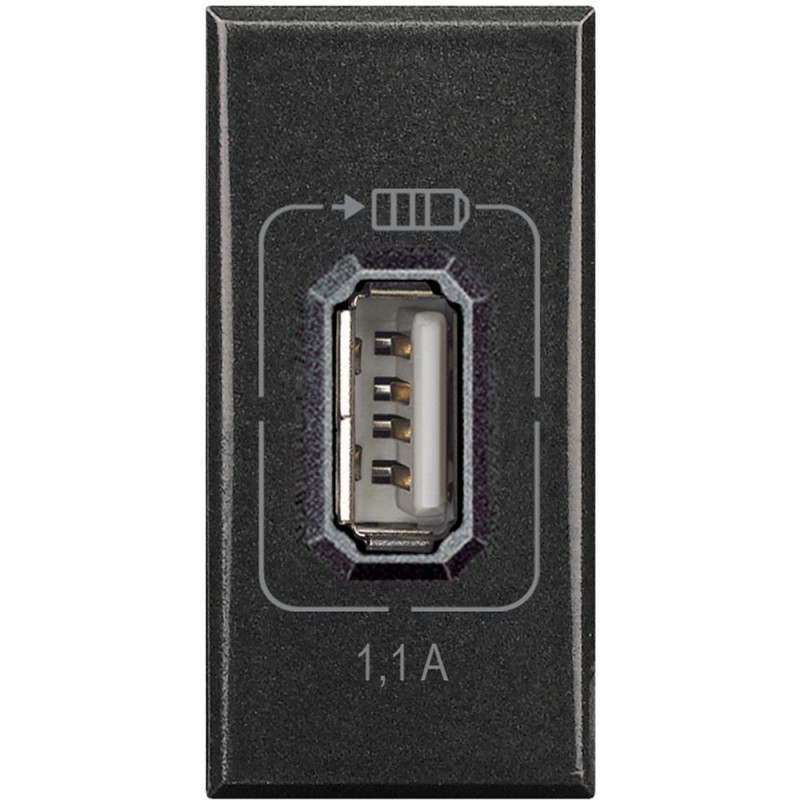 USB-Ladegerät mit 5 Vd.c. Spannung zum Aufladen von ausschließlich elektronischen Geräten bis 1100 mA wie z.B. Handys, Smartphones, Tablets u.ä., Spannungsversorgung 230 Va.c. 1 Modul Anthrazit.