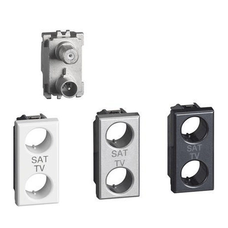 Direkt entmischte Koaxialbuchse für TV-Antennenanlagen. Lieferung mit neutralem Motor und Abschlussplatten in Weiß, Techgrau und Anthrazitgrau.