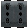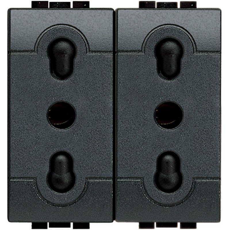 Bticino LivingLight anthrazit Zweiwege-Duplex-Steckdose (innen bereits gebrückt). Die zweipolige Steckdose ermöglicht das Einstecken von sowohl 10A-Steckern (kleine Stecker) als auch 16A-Steckern (große Stecker).