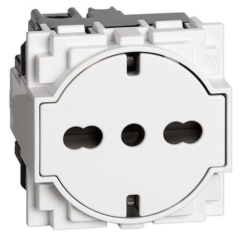 Diese Steckdose ist mit italienischen und deutschen 2P+E-Steckern 10A und 16A kompatibel und bietet eine einzigartige Vielseitigkeit für jede Art von Elektroinstallation. Dank der Abstände von 19 mm und 26 mm eignet sich die Steckdose für alle Standardkonfigurationen, während die geschützten Alveolen und die seitlichen Schutzkontakte die Sicherheit erhöhen.