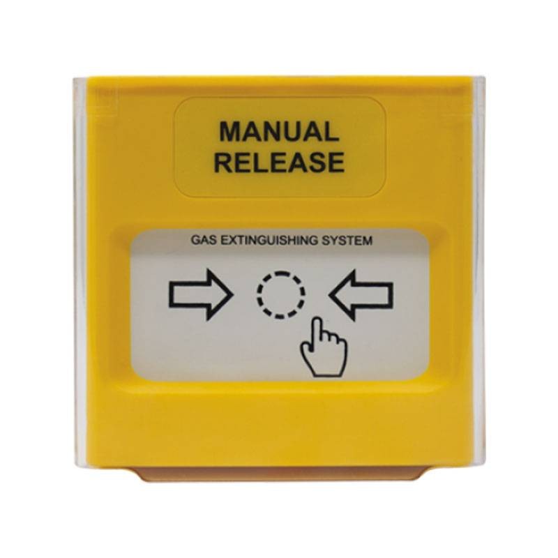 Gelber Comelit-Druckknopfmelder zur Zwangsauslösung des Löschvorgangs im geschützten Bereich. Durch Drücken auf das flexible Element wird der Löschvorgang ausgelöst.
