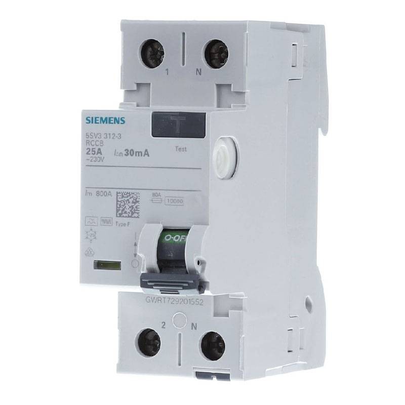 Siemens Fehlerstromschutzschalter 5SV33123 Typ F 25A 2-polig 30mA, 2 Module. Effektiver Schutz gegen indirekte Berührungen und Stromableitungen bei Lasten mit einphasigem Wechselrichter wie Wärmepumpen und Waschmaschinen.