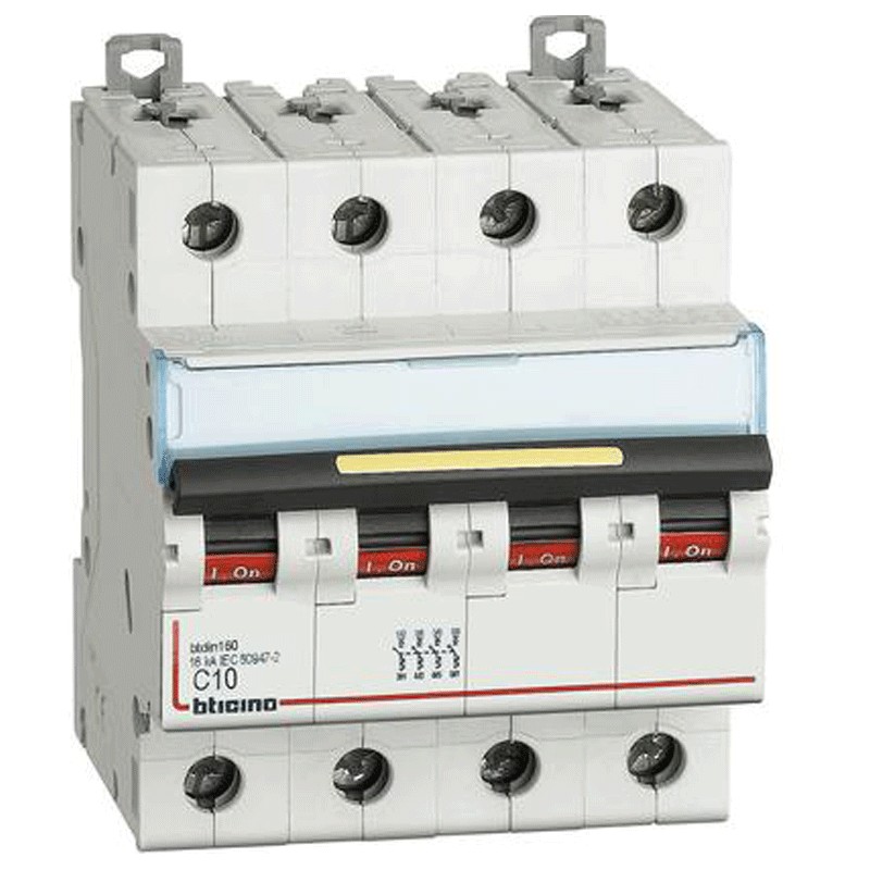 LS-Schalter Bticino, 4 Module, DIN-Anschluss (universell für jede Schalttafel auf dem Markt), Pole 4P, 10 Ampere, Schaltvermögen 16kA, Spannung 400 Vac, Kurve C.