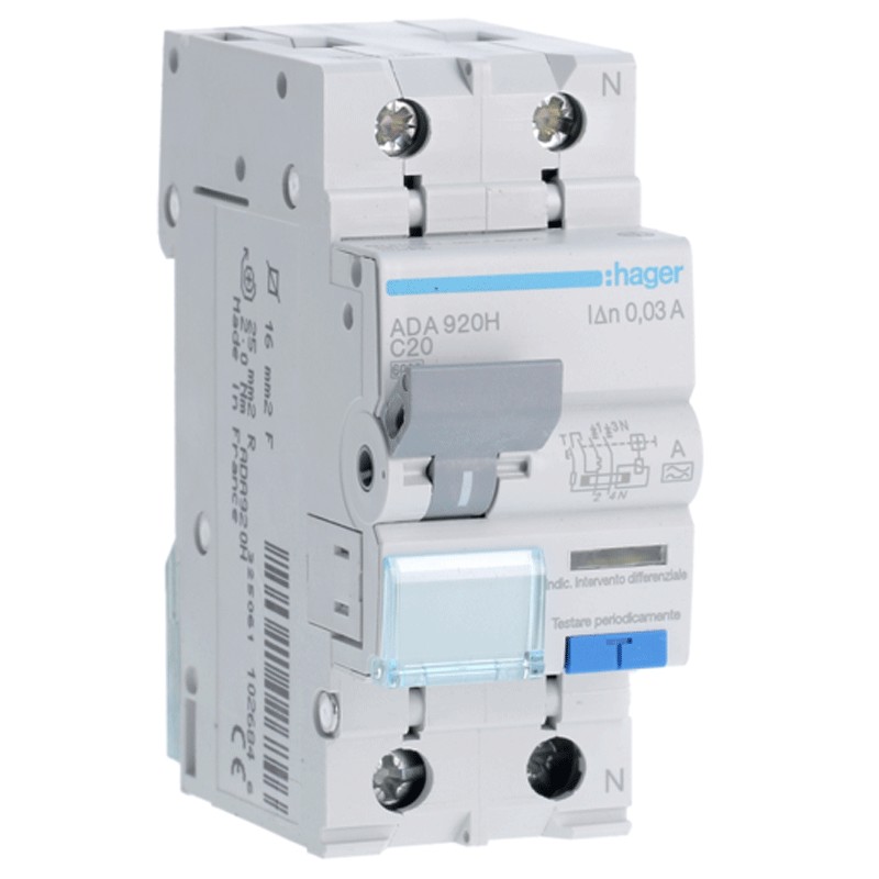Hager Fehlerstromschutzschalter 1P+N 20A 6kA 30mA Kurve C Typ A 2MADA920H
