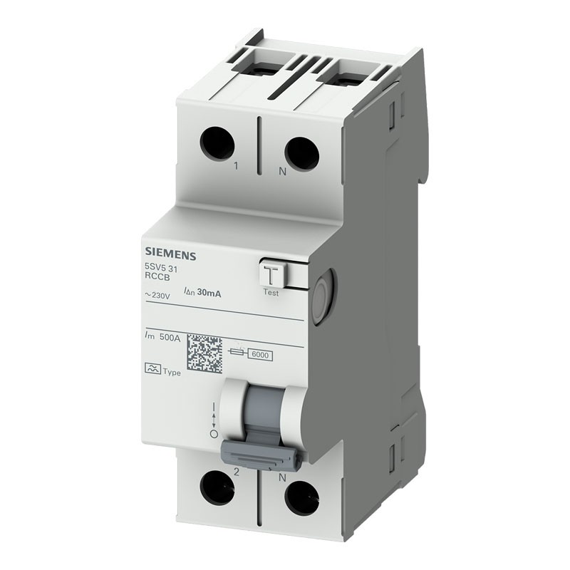 Siemens 40A 2-poliger Fehlerstrom-Schutzschalter, Typ AC, 2 Module, Bemessungsfehlerstrom 0,03mA, Bemessungsspannung 230V, Kurzschlussfestigkeit (Icw) 6kA.