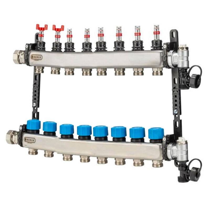 Es besteht aus: Vorlauf- und Rücklaufverteiler, 2 manuellen Entlüftern und 2 Füll-/Entleerungshähnen. Der Verteiler ist mit höhenverstellbaren, schwingungsdämpfenden Halterungen mit einer speziellen Geometrie ausgestattet, die einen Versatz zwischen dem Vorlauf- und dem Rücklaufverteiler ermöglicht und den selbstklebenden Durchgang erleichtert.