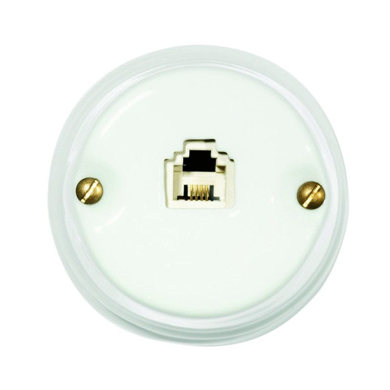 Porzellan RJ11 Telefonbuchse, Farbe weiß. Es wird für elektrische Installationen mit externem, antikem, geflochtenem Kabel verwendet.