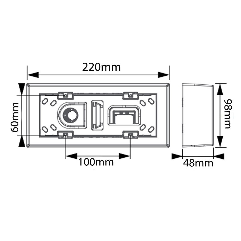 Mit seinen Abmessungen von 220 x 48 x 98 mm und einem Abstand von 100 x 60 mm ermöglicht die Dose die Installation von Schaltern, Steckdosen, Tastern und Steuerungen in einer einzigen Einheit. Dies macht ihn besonders geeignet für zentralisierte Steuerstationen oder für Umgebungen, in denen eine hohe Anzahl von konzentrierten Funktionen erforderlich ist.