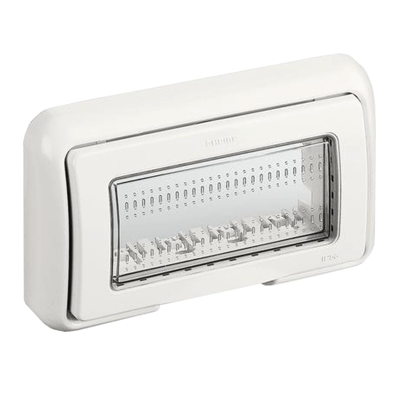 Obstteller Bticino IP55 4 Plätze, weiß. Sie können in alle Produkte der Bticino Matix-Serie eingebaut werden. Die Schutzart IP55 wird bei geschlossenem Deckel und bei Installation des Artikels an glatten, fugenlosen und wasserdichten Wänden (glatte Fliesen, Marmor) erreicht.