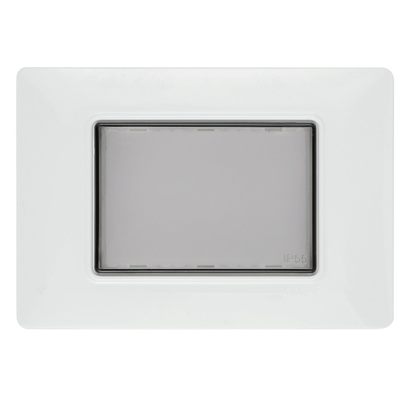 Vimar IP55 Wandabdeckung, 3 Module, mit Schrauben, für Unterputzdosen, Farbe RAL 7035 grau. Es ist möglich, darin alle Vimar-Produkte der Serien Eikon, Plana und Arkè zu installieren.