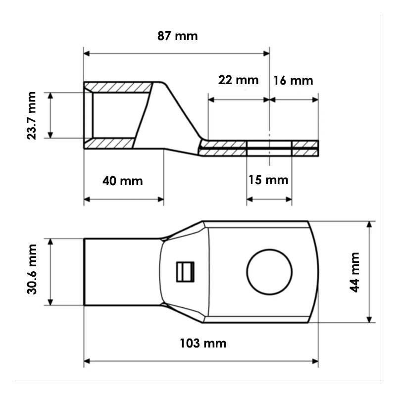 Die Geometrie der Spannzange wurde optimiert, um die Positionierung in Presswerkzeugen zu vereinfachen und die Installationszeit zu verkürzen. Die M10-Bohrung in der Lasche ermöglicht die sichere Unterbringung des Kabelschuhs in Standard-Anschlussklemmen und Klemmen und gewährleistet eine solide und dauerhafte elektrische und mechanische Abdichtung.