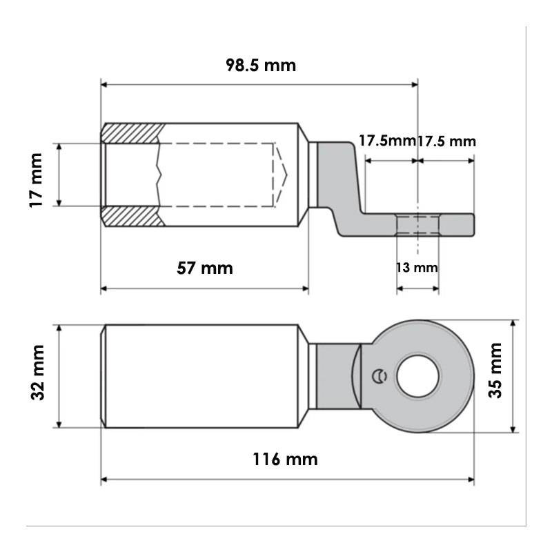 Die Bimetallstruktur besteht aus: einem Kragen aus reinem Aluminium (>99,5%) für Aluminiumleiter und einer Lasche aus elektrolytischem Kupfer (>99,9%) für den Anschluss an Kupferschienen, Klemmen oder Terminals.