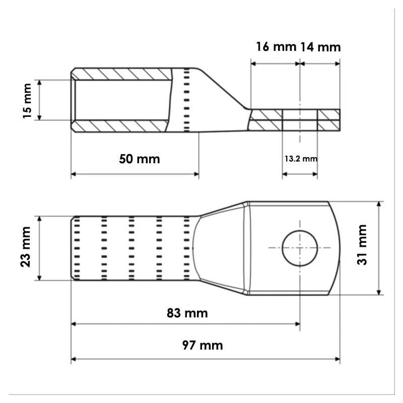 Die aus hochreinem (>99,9 %) geglühtem Elektrolytkupfer gefertigte Klemme garantiert höchste elektrische Leitfähigkeit, geringen Stromflusswiderstand und eine lange Lebensdauer. Die elektrolytische Verzinnung bietet Schutz vor Oxidation, so dass sie auch für Umgebungen mit hoher Luftfeuchtigkeit oder Verunreinigungen geeignet ist.