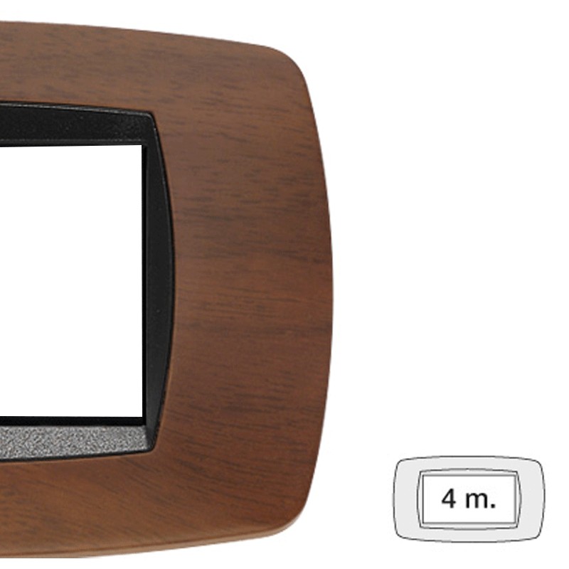 Master Modo Abdeckrahmen 4 Module dunkel Walnuss Farbe. Der Abdeckrahmen wird auf die Rahmen 38004, 38004-F montiert, oder durch den Adapter 39034 ist der Abdeckrahmen kompatibel mit den Rahmen LN4704 und L4704 der Bticino Living und LivingLight Serie.