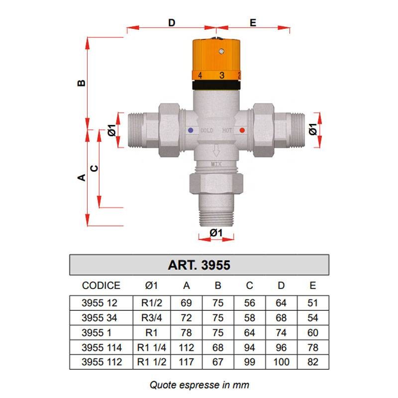 - Mischventil für Solaranlagen, aus verchromtem Messing, mit Außengewinde 1/2"-3/4-1"-1"1/4-1"1/2 mit flachem Sitz, komplett mit Rohrverschraubungen und EPDM-Dichtungen, Einstellknopf aus Nylon, mit nummeriertem Wählschalter von 1 bis 5, der einem Einstellbereich von 30-65°C entspricht, und Temperatursperre, Thermoelement aus Wachs. Max. Eingangstemperatur 110°C. Max. Betriebsdruck 10 bar.