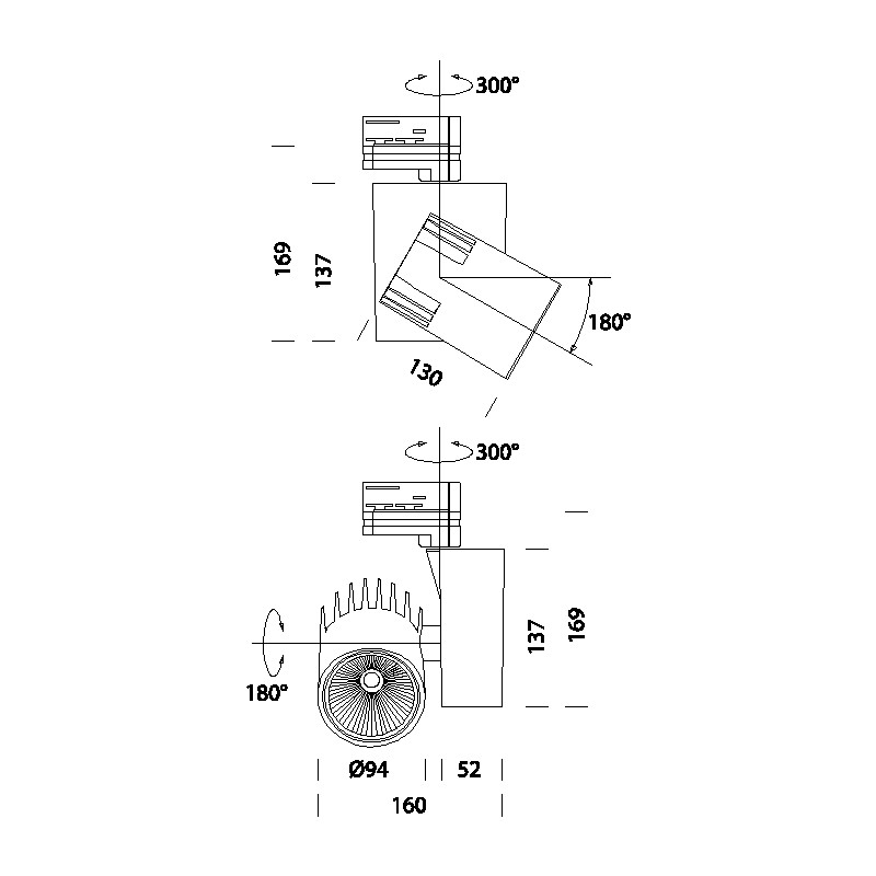 Der Projektor ist vollständig schwenkbar, mit einer Drehung in der vertikalen Achse von bis zu 300°, was eine maximale Freiheit in der Lichtrichtung ermöglicht. Der integrierte Universaladapter macht ihn mit den meisten handelsüblichen Stromschienen kompatibel, was die Installationsphase vereinfacht und ihn auch für Nachrüstungen ideal macht.