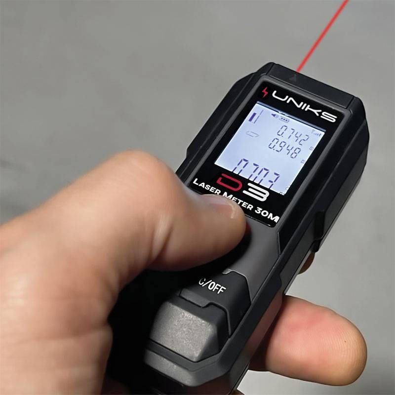 Uniks Laser-Meter mit dem Satz des Pythagoras, ermöglicht die einfache Messung von Entfernungen von 30M mit einer Genauigkeit von 5mm und über interne Algorithmen ermöglicht Messungen von Fläche, Volumen.
