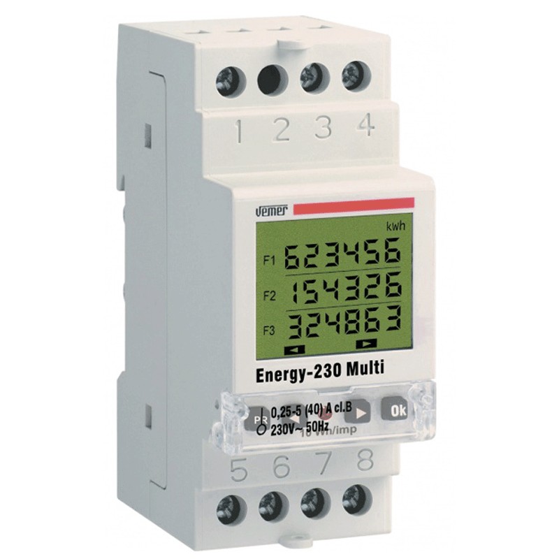 Energiezähler Vemer Energy-230 Multi, für die Montage auf DIN-Schiene, zur Anzeige des Wirkverbrauchs in Einphasensystemen, aufgeteilt nach Zeitbereichen, wie von der Strombehörde vorgeschrieben.