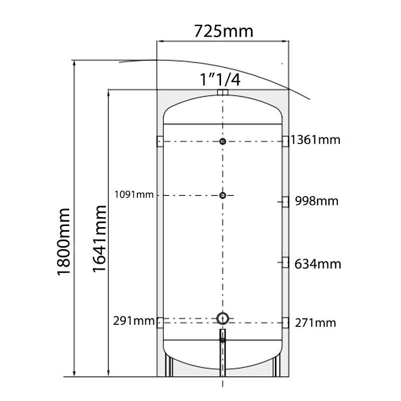 Der Puffer ist mit einem 1"½ Gas I Anschluss für die elektrische Integration ausgestattet, nützlich, wenn ein zusätzliches Heizsystem (wie ein elektrischer Widerstand) installiert werden soll. Es gibt auch einen ½" Gas I Anschluss für die Instrumentierung, der unerlässlich ist, um Sonden, Thermometer, Messgeräte oder Sensoren zu installieren, die die Temperatur und den Betrieb des Systems überwachen.