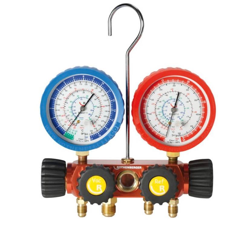 Rothenberger II Plus 4-Wege-Manometer-Baugruppe für R410A und R32 mit folgenden Merkmalen