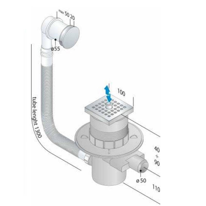 Die Auffangwanne ist mit einem quadratischen Gitterrost aus rostfreiem Stahl von 3 mm Dicke mit "Klick-Klack"-Taste und "Überlauf"-Knopf ausgestattet.