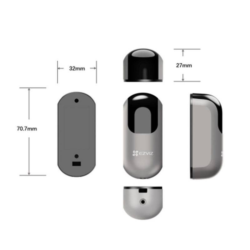 Verpackungsinhalt und kompakte Abmessungen: Die Verpackung enthält 1 TX und 1 RX, bereit zur Installation. Die kompakten Abmessungen (70,7 × 32 × 27 mm) helfen, ein dezentes ästhetisches Ergebnis zu erzielen, ohne übermäßige Hindernisse am Eingang.