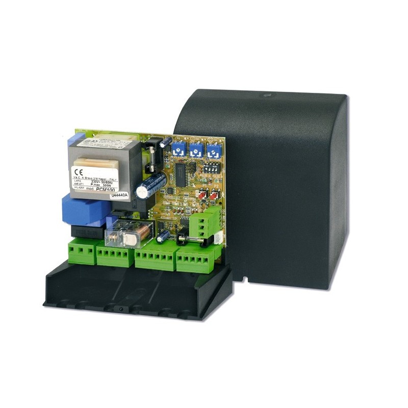 PCM100 ist eine Automatisierungssteuerung für Schiebetore. Er steuert einen Getriebemotor mit 230Vac 700VA max., Typ MS100 oder MS200, und einen Getriebemotor mit 380Vac 550W MS200T. Das PCM100 ist mit einem ausgeklügelten Selbstdiagnosekreis ausgestattet, der den korrekten Betrieb des Systems und der angeschlossenen Geräte ständig überwacht; bei Anomalien greift dieser Kreis ein und blockiert den Betrieb der Steuereinheit. Die Überwachung des Betriebs der an die Steuereinheit angeschlossenen Peripheriegeräte wird über LEDs an der Schaltung angezeigt. Darüber hinaus ist das PCM100 mit einer elektronischen Bremse ausgestattet, die den Anhalteweg des Tores verkürzt. Als Alternative zur Bremse wird die Verlangsamungsfunktion 3 Sekunden vor dem Auslösen des Endschalters aktiviert, sowohl beim Öffnen als auch beim Schließen, so dass das Tor langsam angefahren werden kann. Vor jeder Torbewegung wird das Blinklicht für ca. 2 Sekunden aktiviert.