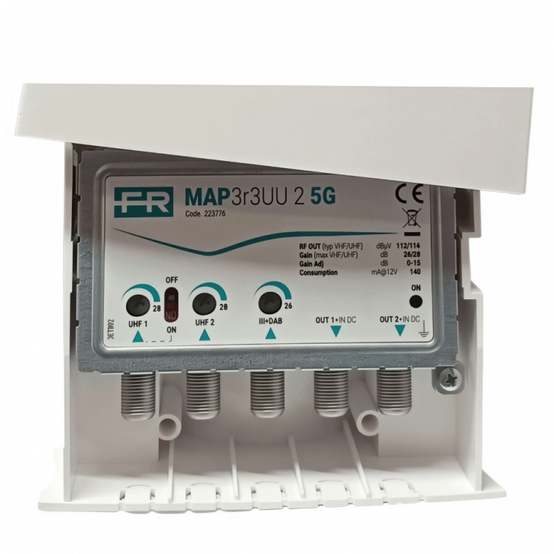 Mastverstärker Fracarro MAP3r3UU 2 5G mit 3 Eingängen III+DAB/UHF/UHF, Verstärkung 26/28 dB und doppeltem Ausgang. Unabhängige Einstellungen, integrierter 5G-Filter bei 694 MHz, LTE-freie Abschirmung und professionelle Struktur aus ZAMA.