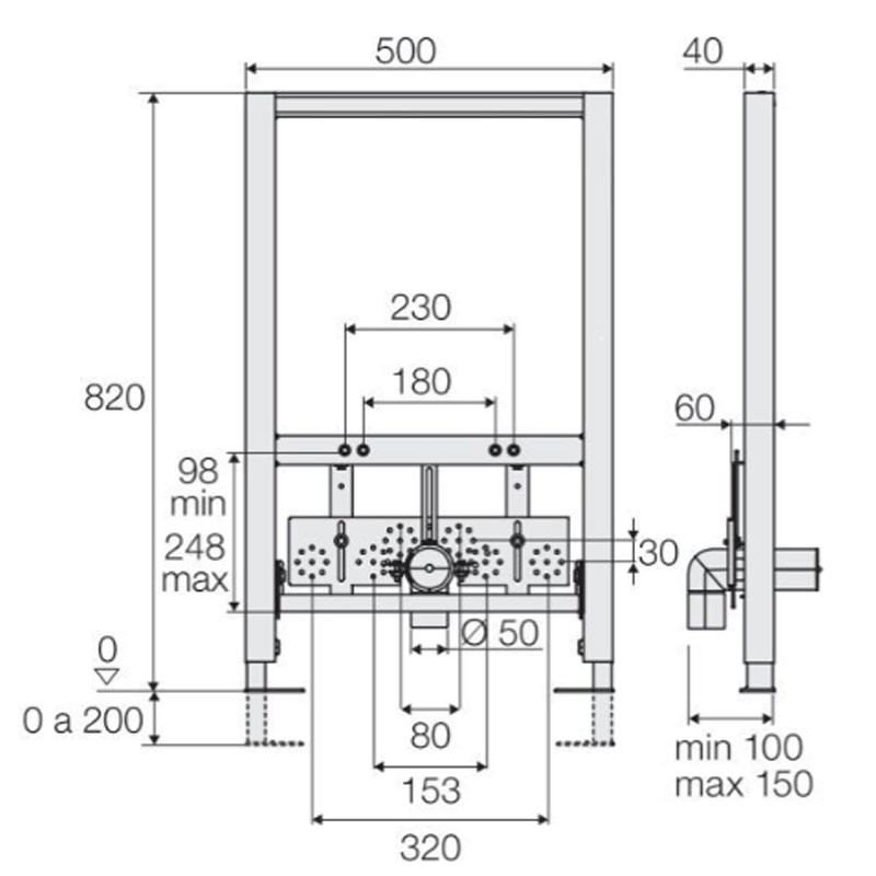 Geschützter Rohrrahmen, einschließlich Halterungen und Befestigungsmaterial für Wand-, Boden- und Aufputz-Bidet. Armaturenplatte für höhenverstellbaren Wasseranschluss.