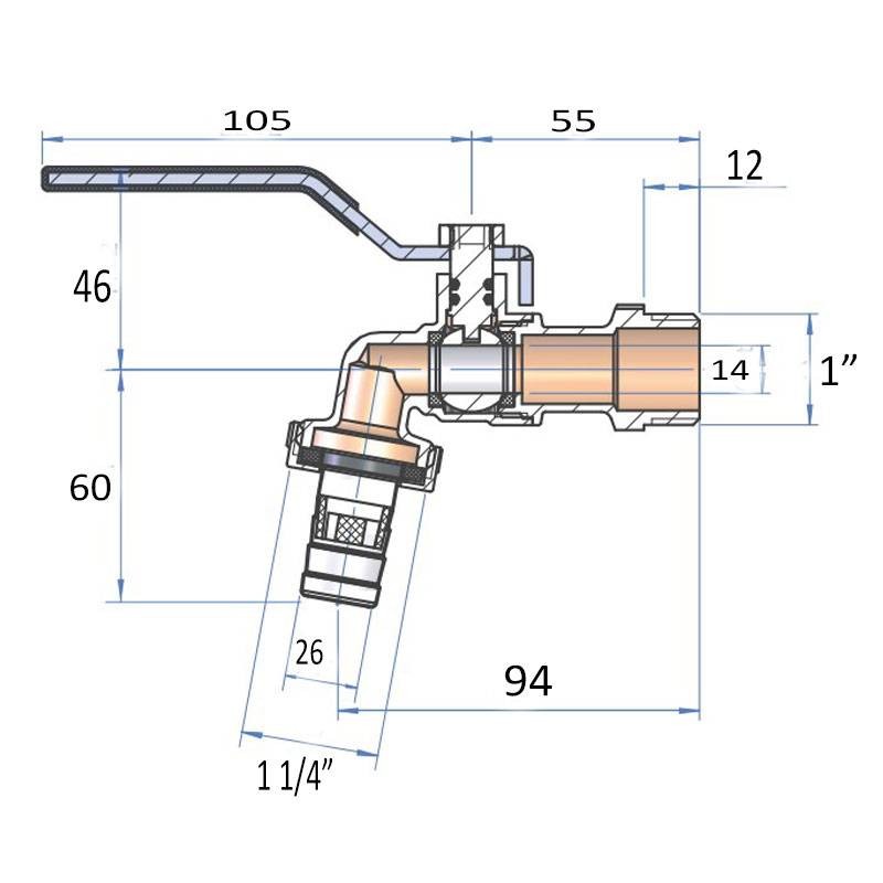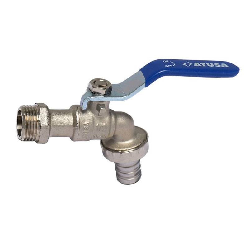 Gebogener Kugelhahn von Atusa mit Doppelschlauchanschluss und Frostschutzsystem, mit folgenden Eigenschaften: