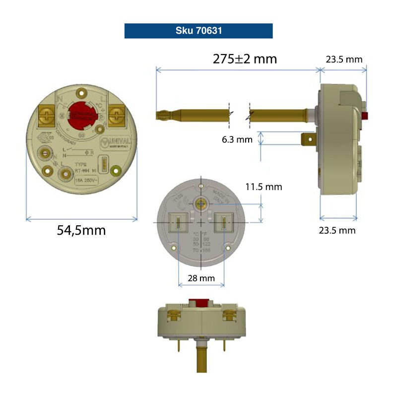 - Schalttemperatur (ON/OFF): T1 (OFF): 70°C ± 5 - T2 (ON): 60°C ± 5