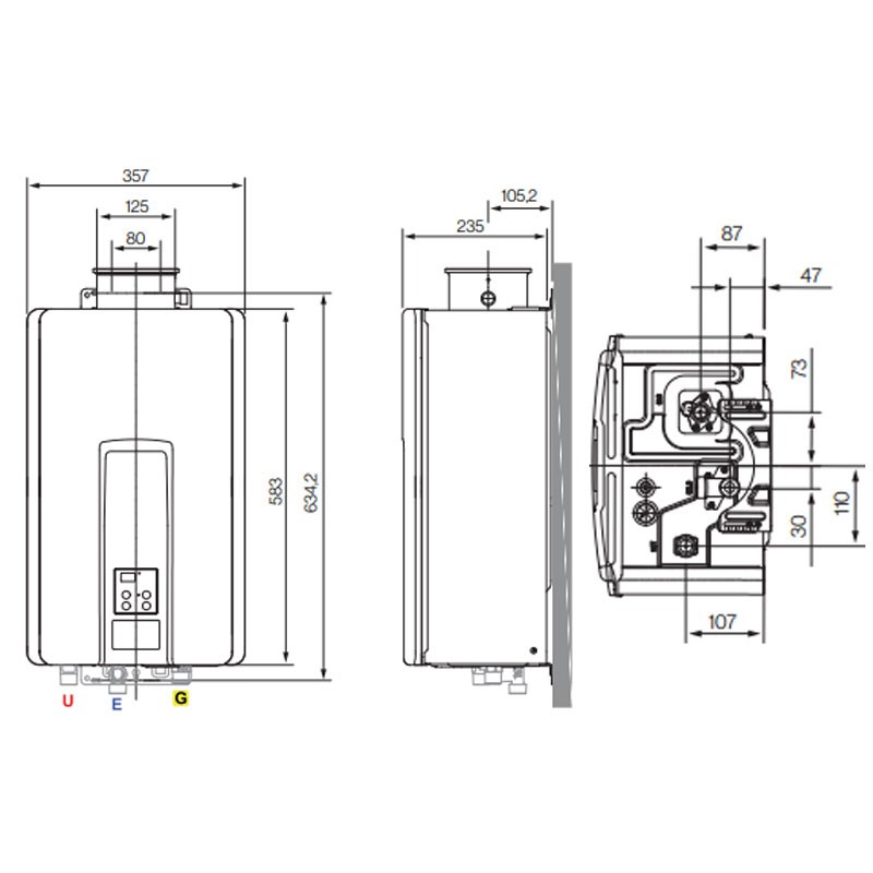 Infinity 28i ist ein Warmwasserbereiter, der 28 Liter/Minute warmes Wasser liefert. Dieser Warmwasserbereiter wird innerhalb des Raumes installiert und muss an einen Schornstein angeschlossen werden, damit die Abgase ins Freie abgeleitet werden können:
