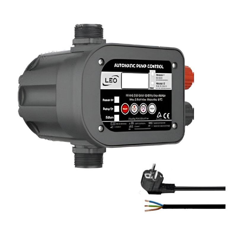 Leo Pumps elektronischer Durchflussschalter für elektrische Pumpen mit Doppeldruck- und Druckschalterfunktion, einstellbarem Druck über Digitalanzeige und automatischer Rückstellung, mit folgenden Merkmalen