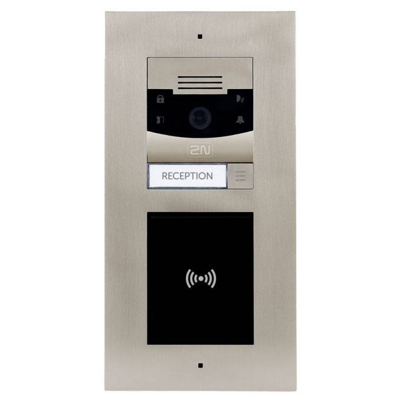 Verso 2N IP Pushbutton RFID card reader module, with NFC enables control of inputs using contactless cards or key fobs. The module supports standard 13.56 MHz cards or other carriers: