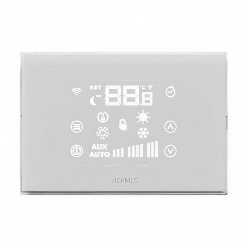 Aermec Touch Recessed Thermostat for Fan Coils is an advanced device designed for precise control of fan coils with asynchronous and brushless motors. Also suitable for mixed systems, such as fan coil units and radiant panels, it offers an intuitive touch interface, a modern design and the possibility of management via VMF-IR remote control thanks to the built-in infrared receiver, with the following features: