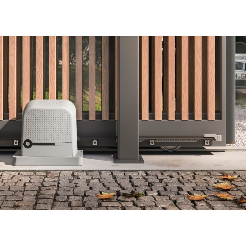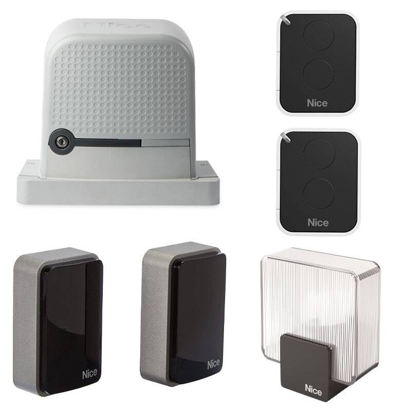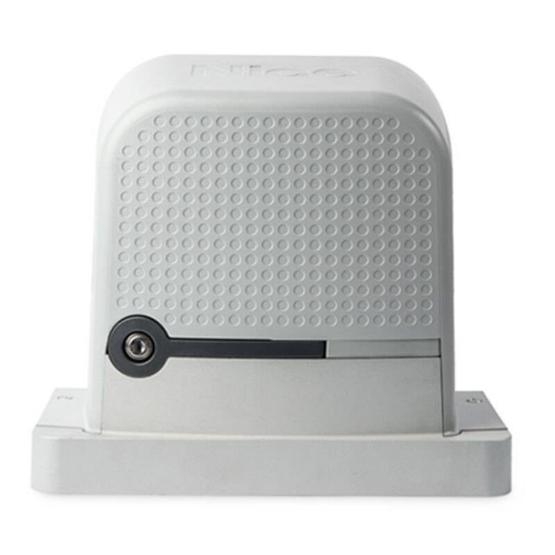 Nice automatic sliding gate kit For sliding gates up to 600 kg, Irreversible, 230 Vac, electromechanical limit switch, control unit with built-in radio receiver.