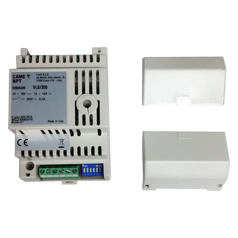 Relay unit for auxiliary services (lights control, openings, ringtones, etc).Made of plastic housing for installation in electrical panels (EN50022), size 4 DIN modules low. Degree of protection IP30. The unit has 2 relays with a contact in the switching power interruption 22 A resistive load (1 A inductive) at max voltage 250V AC (excitation coil with power supply 10/14V AC or 14/18V DC - 50 mA). The two relays are associated by default to the commands for the door lock and AUX2. It is also equipped with 6 switches for programming of the control box, 1 potentiometer for adjusting the activation time of relay 1 (door lock) and 1 indicator LED to indicate the status of data reception from the BUS line.