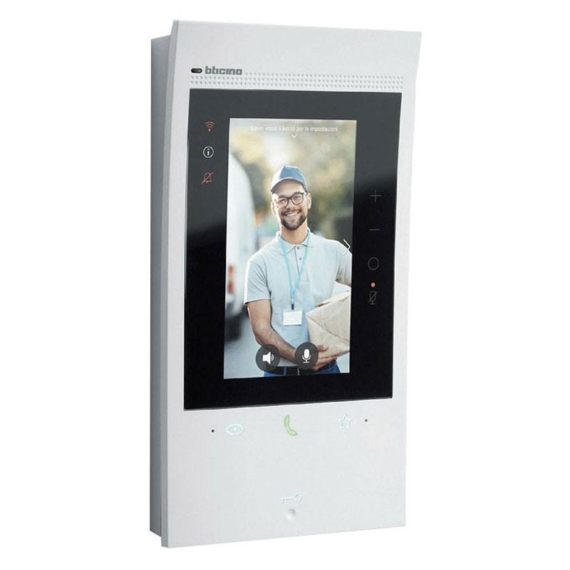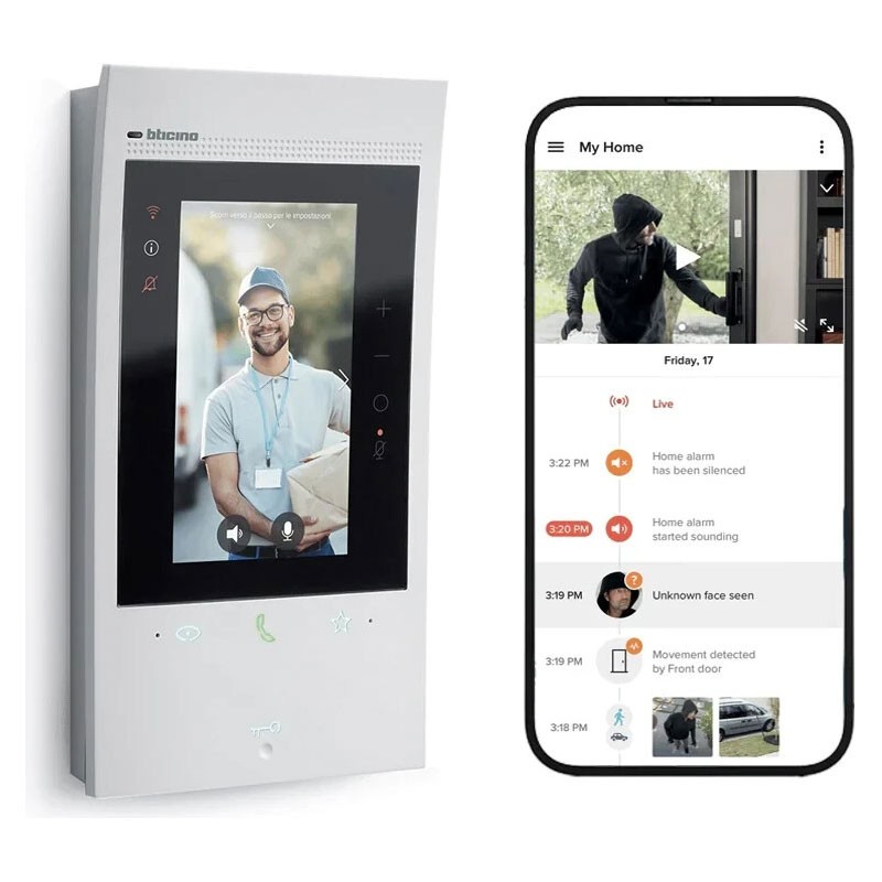 The device needs to be configured by physical input of configurators or from menus taking advantage of a greater possibility of customization of functions and associated texts. Thanks to the Wi-Fi connection, it is possible to associate the video door phone with the Home + SecurityApp (available for Android and iOS). LApp allows you to use the main functions of the video door phone (call reception, lock opening, event timeline display and door station activation/camera cycling). Through the Home + Security lApp it is also possible to manage the products of Netatmo's Security offer (outdoor and indoor cameras, door and window sensors, indoor siren, smoke detector). This allows you to quickly and easily create a Smart security system.