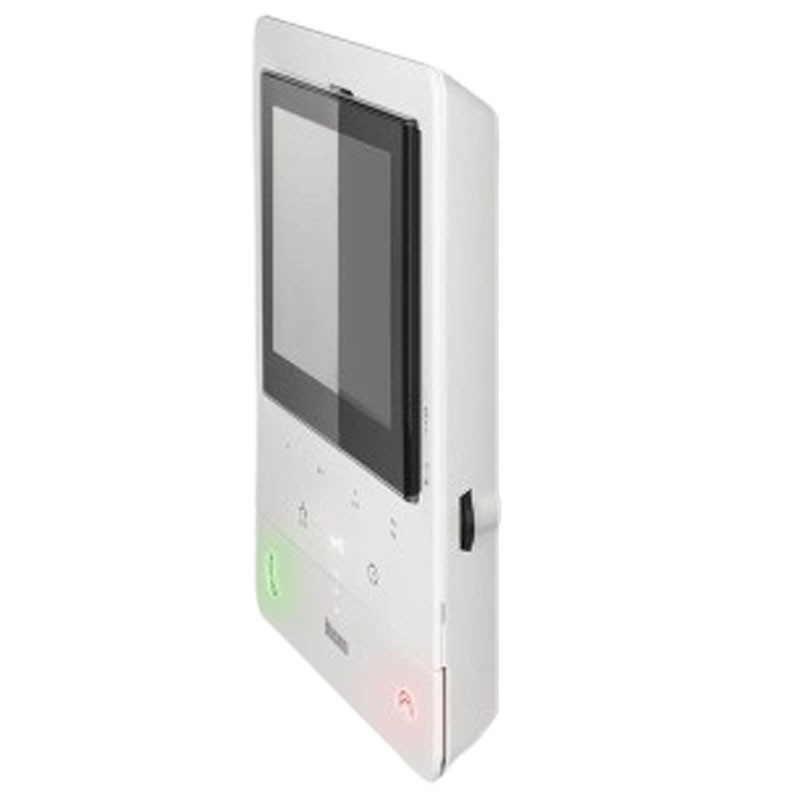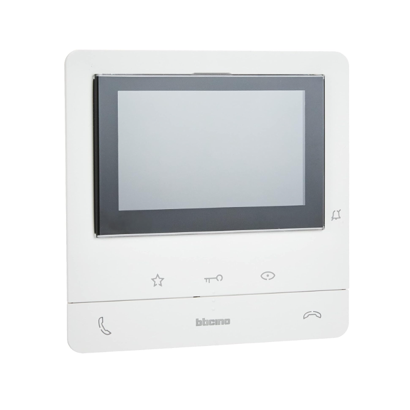 - The video door phones have a 5-inch color LCD display and 2 physical buttons for controlling the main video door phone functions-answering and closing the call-plus 3 touch buttons that allow activation of the electric lock, activation of the door station/cycling, and customization of a quick action that the user uses most frequently-e.g., stair light control, intercom, additional electric lock activation, and general activations