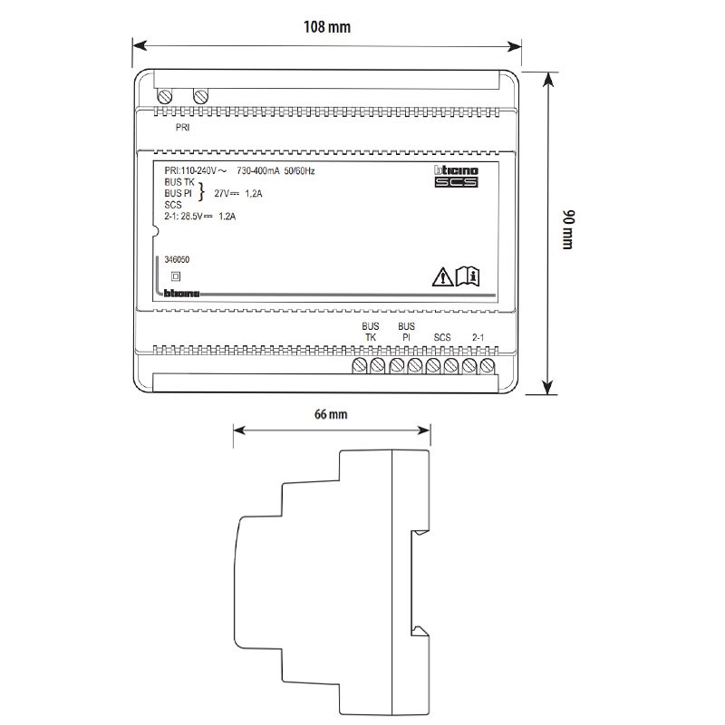 Bticino power supply for audio and video systems 2 WIRES 1,2A in 6 DIN modular housing, it supplies two safety extra-low voltage outputs.
