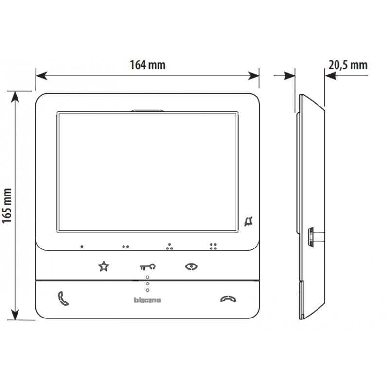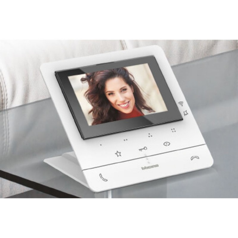- Has 2 physical buttons for controlling the main video door phone functions - call answering and closing - has 3 touch buttons for controlling the main functions - electric lock activation, staircase light control and door station/loop activation - plus an additional 4 configurable touch buttons that take on different functions - e.g., intercom, additional electric lock activation, general activations