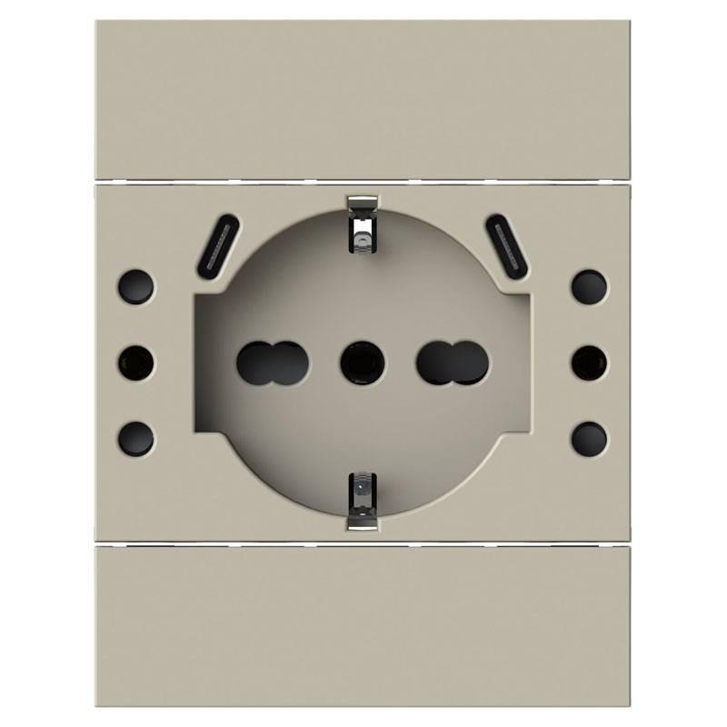 USB socket 4Box P503 compatible with Bticino LivingNow Sabbia series, With 5 outlets and a single power terminal, consisting of 2 USB 3A Type C outlets, 1 schuko, 2 10A outlets and 1 10/16 A outlet.