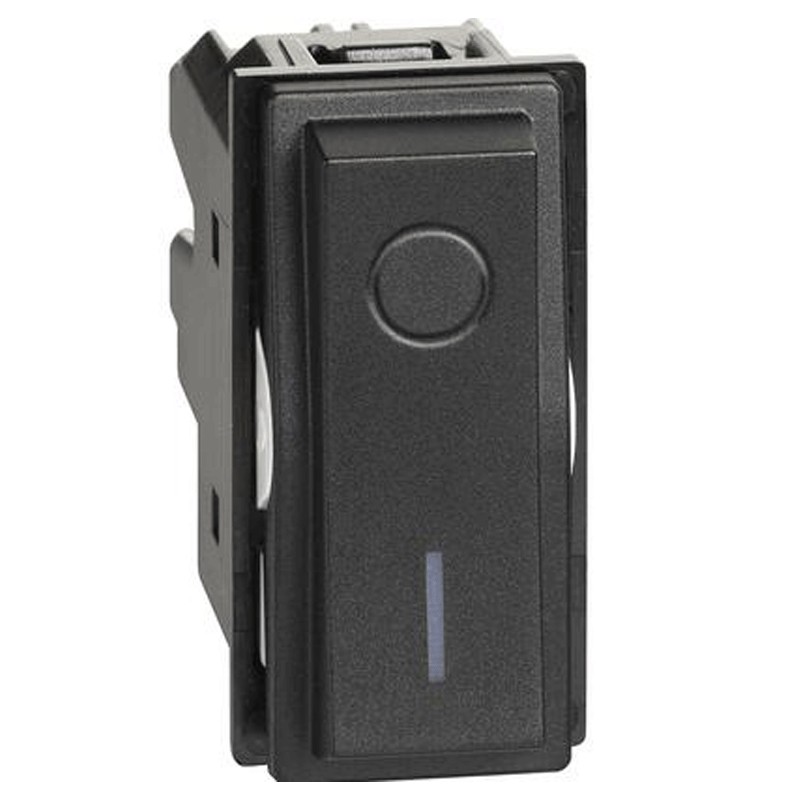 Bticino Living Now 2P 16A, 250 Va.c. double pole switch, black, illuminable, 1 module. The switch is usually used for household appliances.
